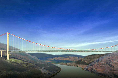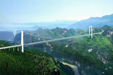 湖北四渡河特大橋全長1100米,主跨900米,被譽為世界第一高懸索橋。...